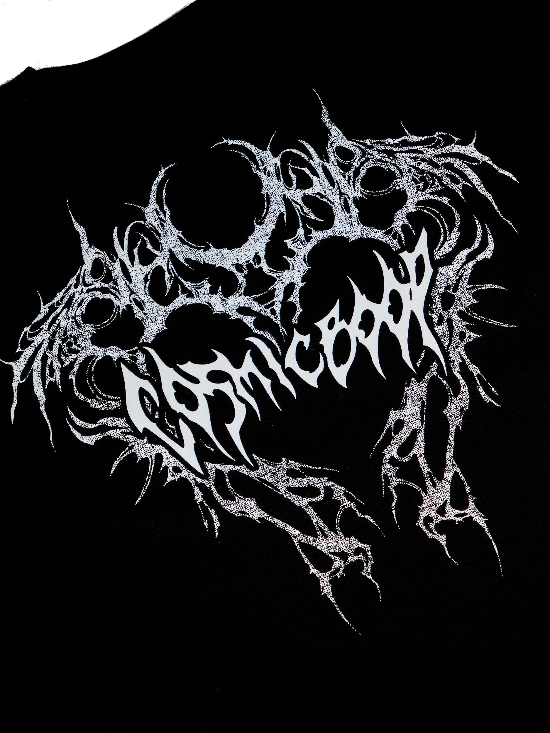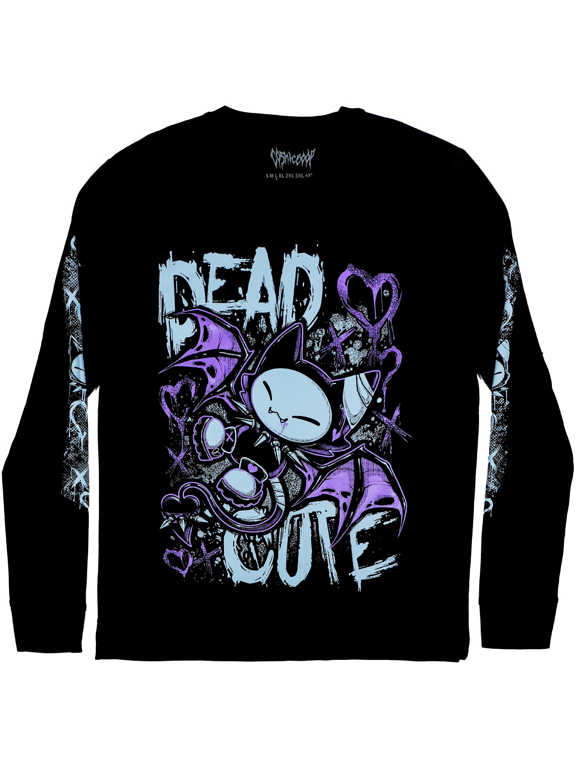 Screen printed design on a long sleeve black T. Features a large front print, back and dual sleeve prints.