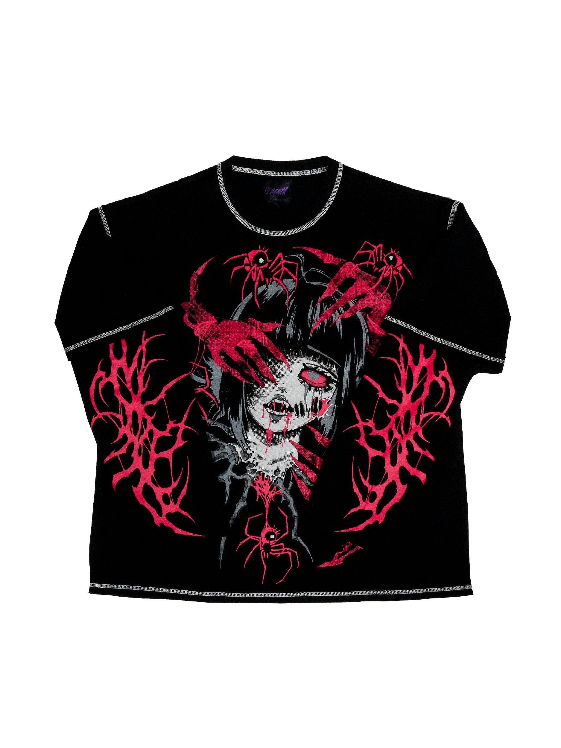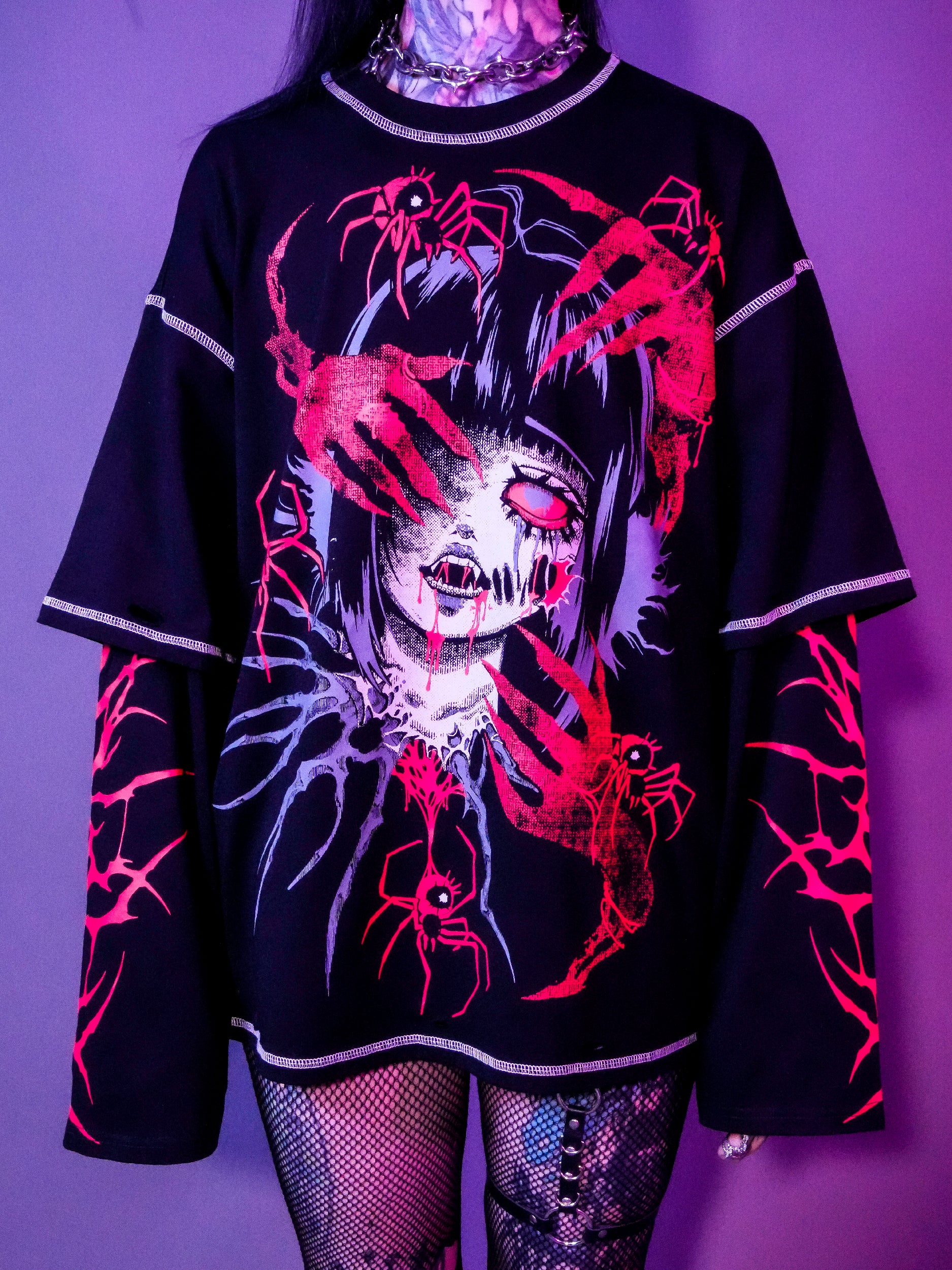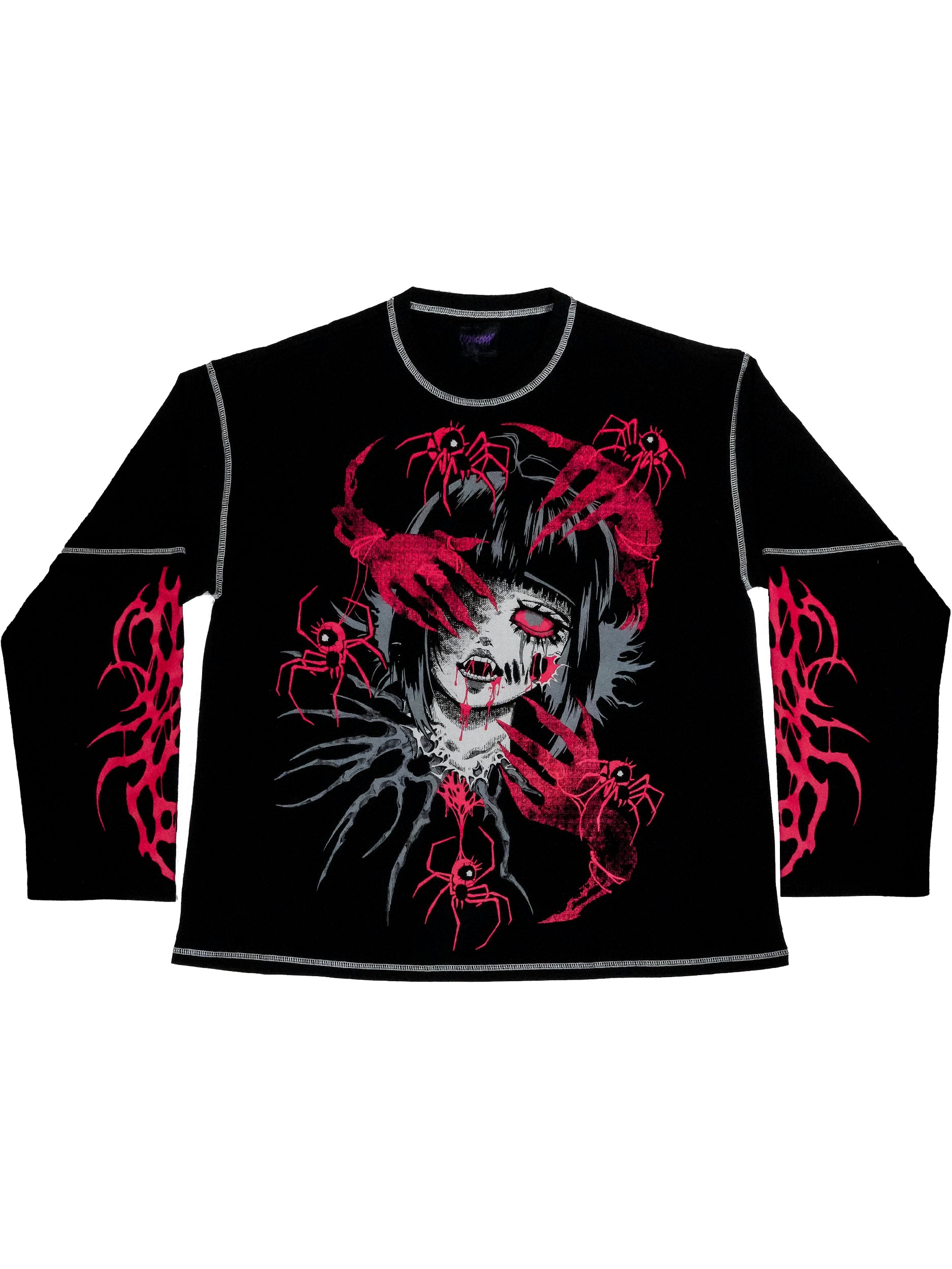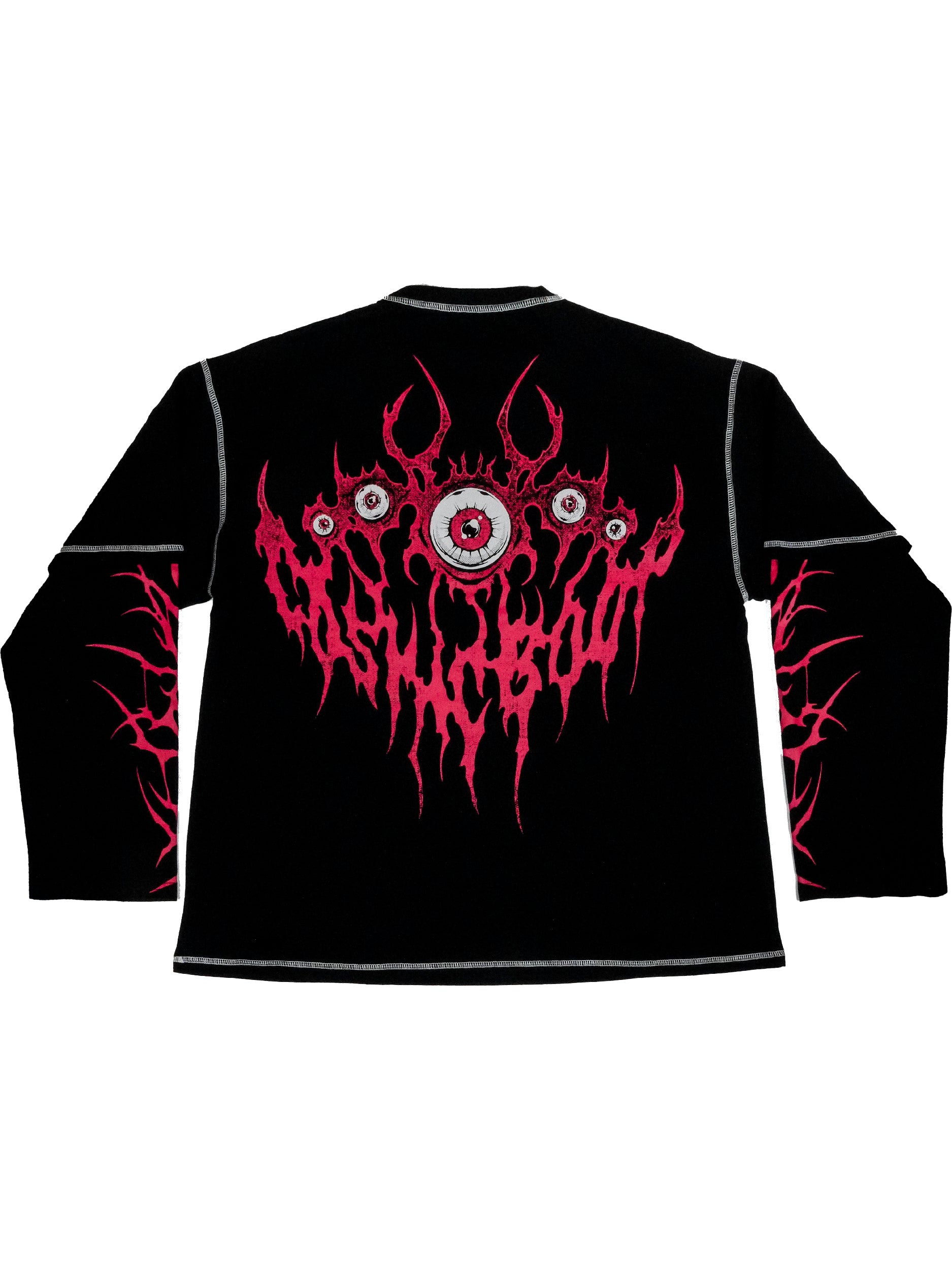 Screen printed design on an oversized, layered black long sleeve. Features a large front, back print and sleeve prints with contrast stitching. Sleeves, hem and collar all feature distressing.