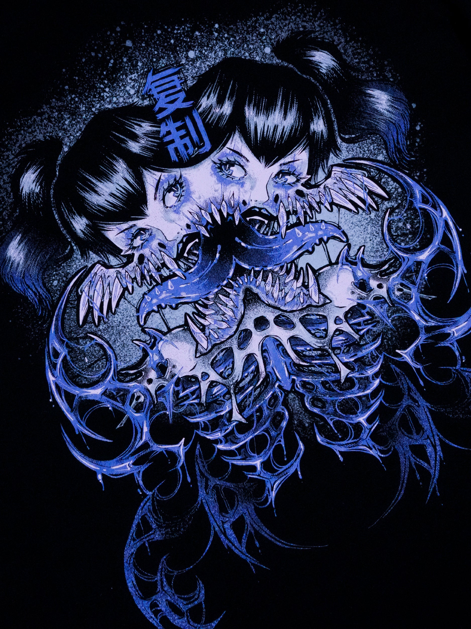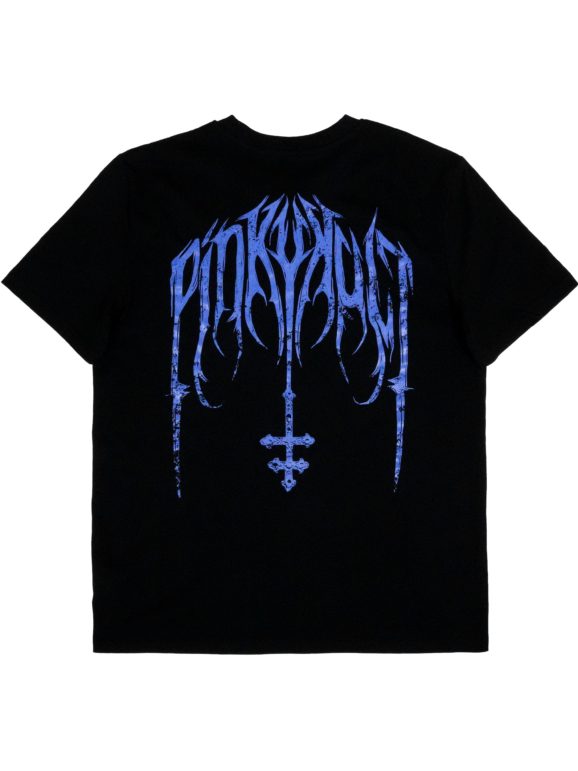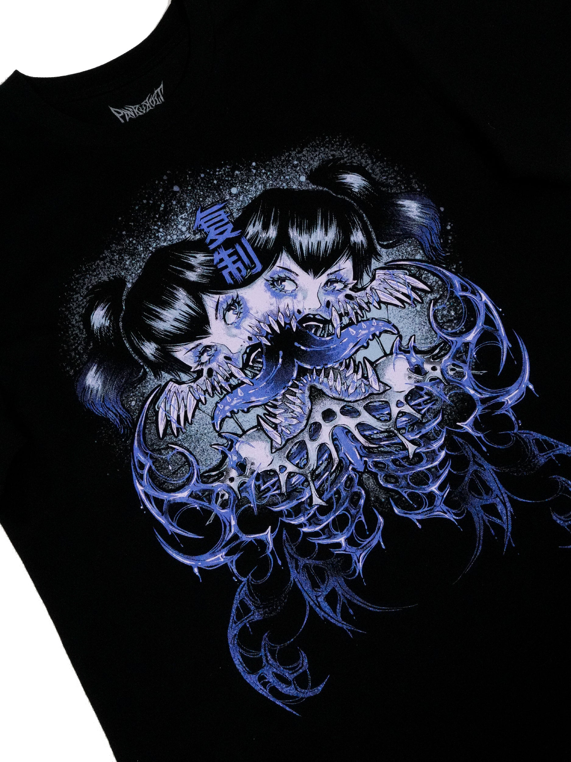 Screen printed design on a short sleeve black t-shirt. Features a large front and back print.