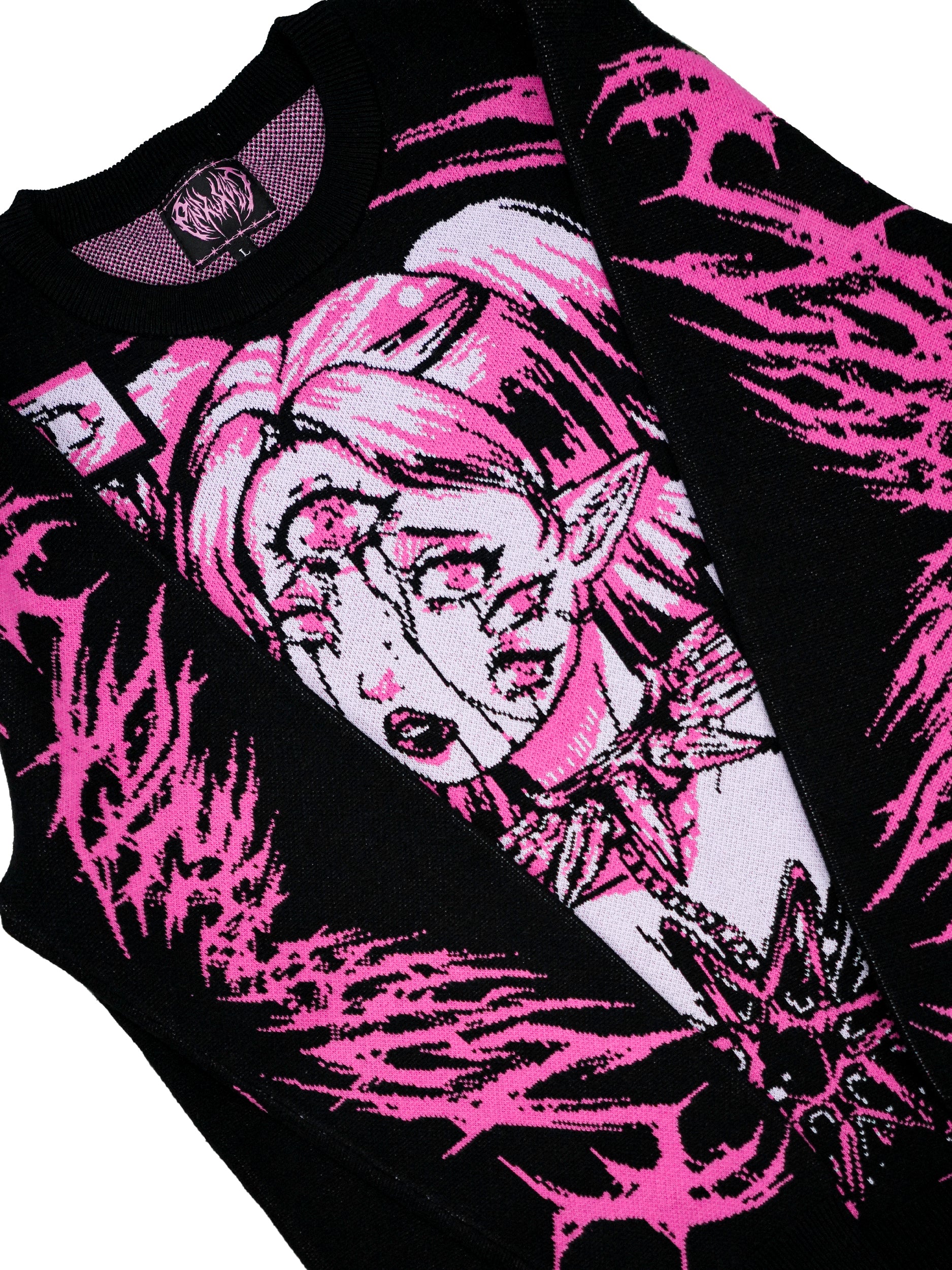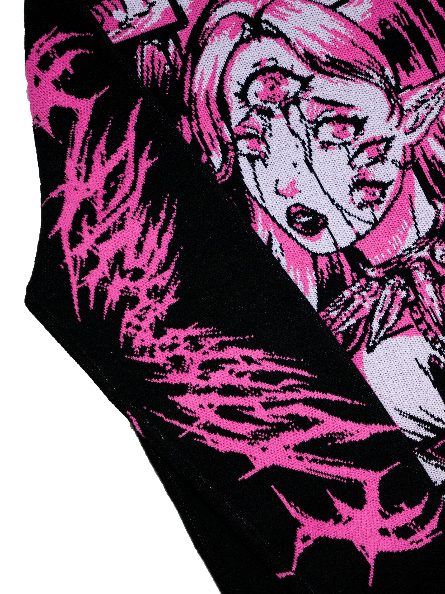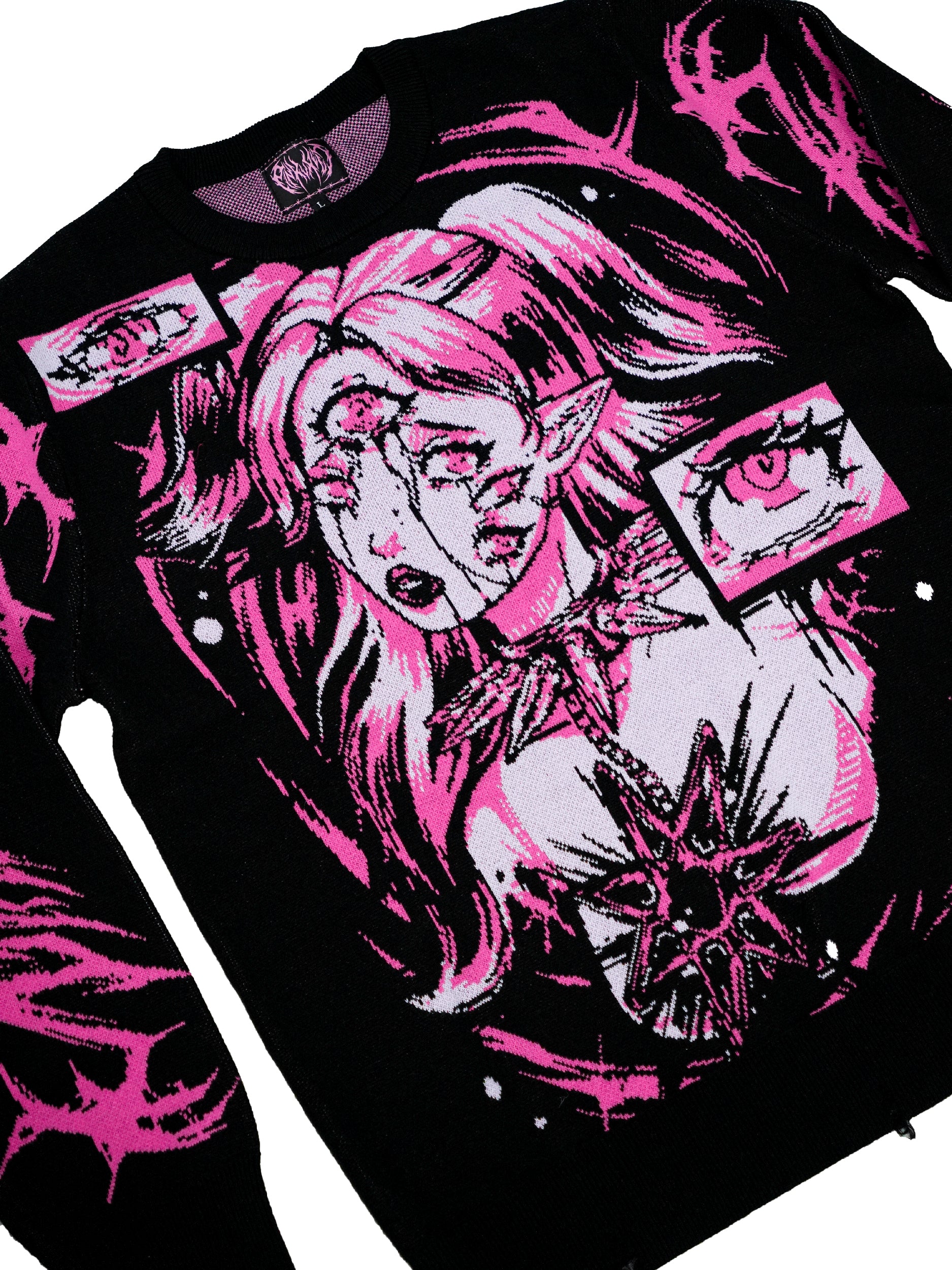 Jacquard pattern design on an oversize, black jumper. Features oversize design detail on the front and a logo design on the front and back of both arms. Bottom hem features distressing.