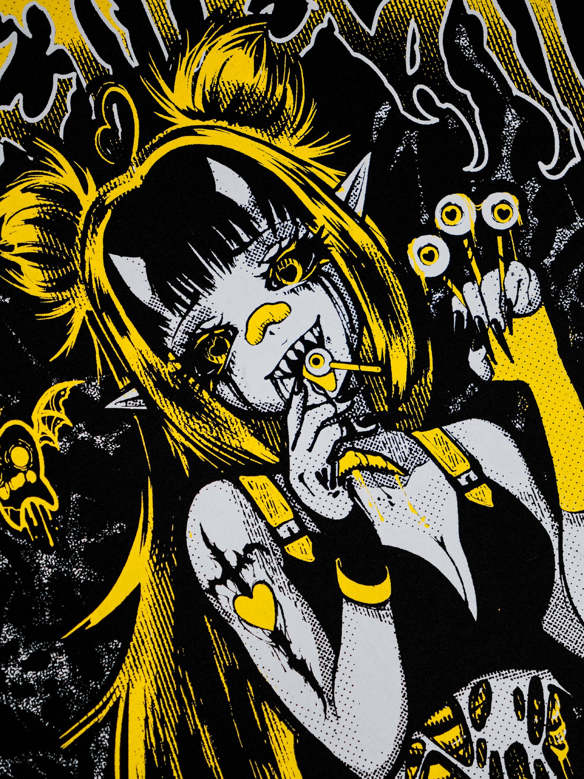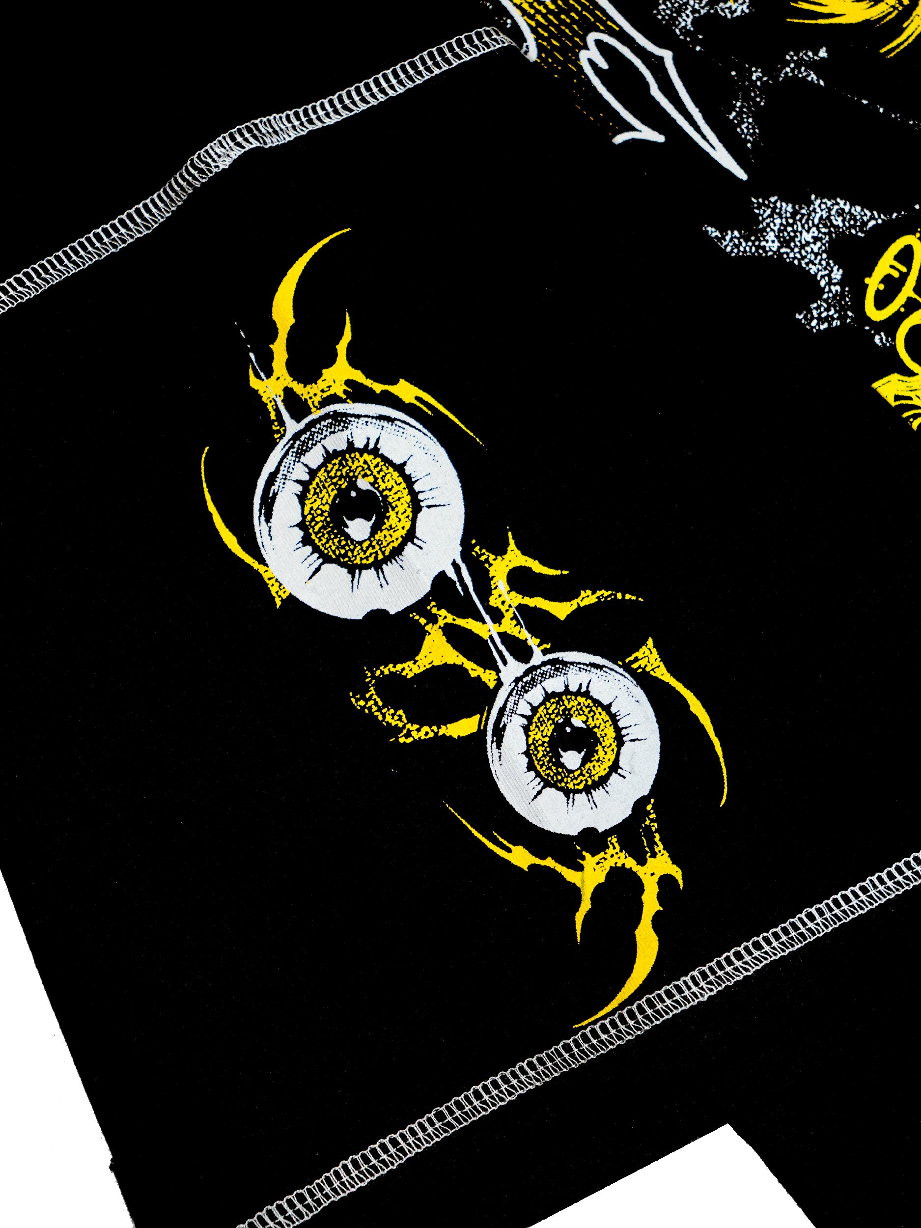 Screen printed design on an oversized short sleeve black t-shirt. Features a large front, right sleeve and back print and contrast stitching. Sleeves and hem all feature distressing.