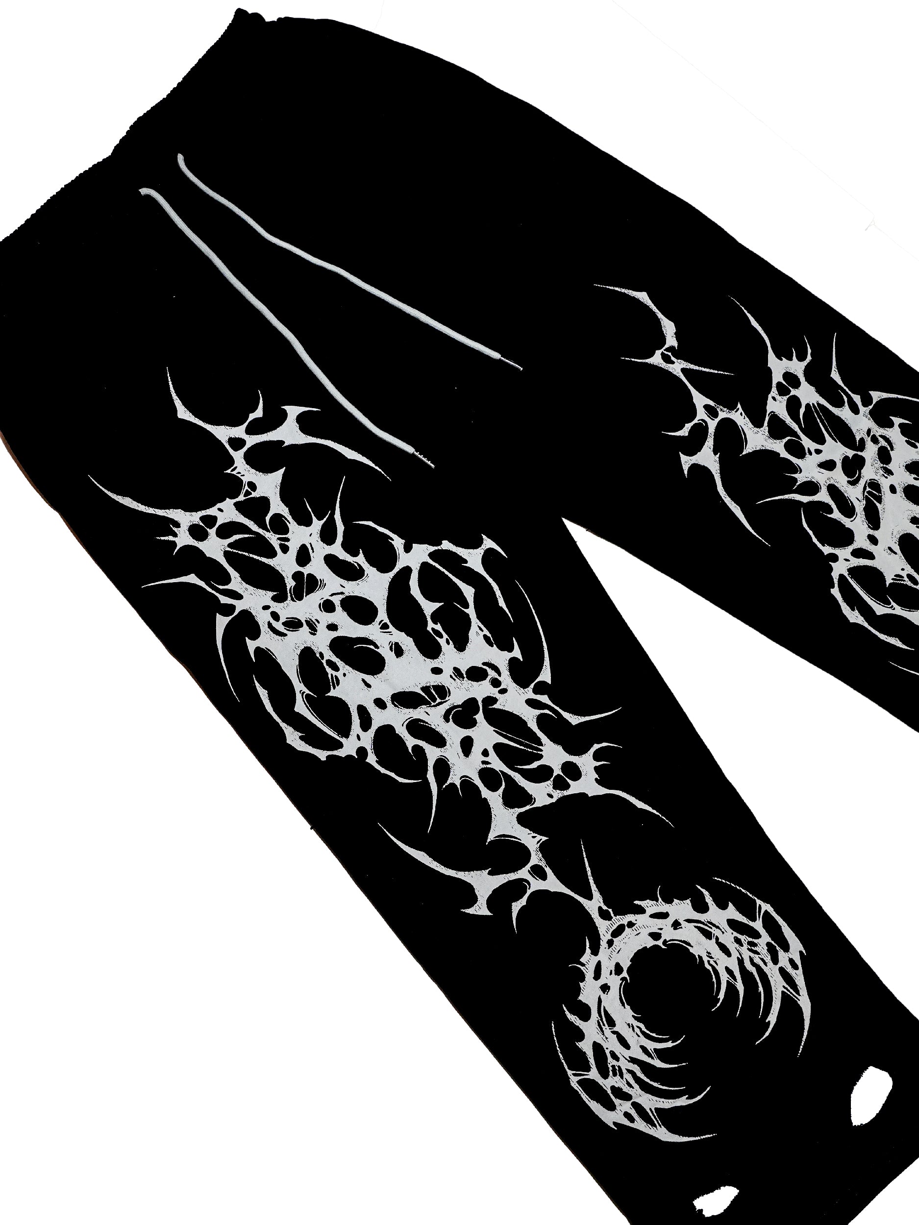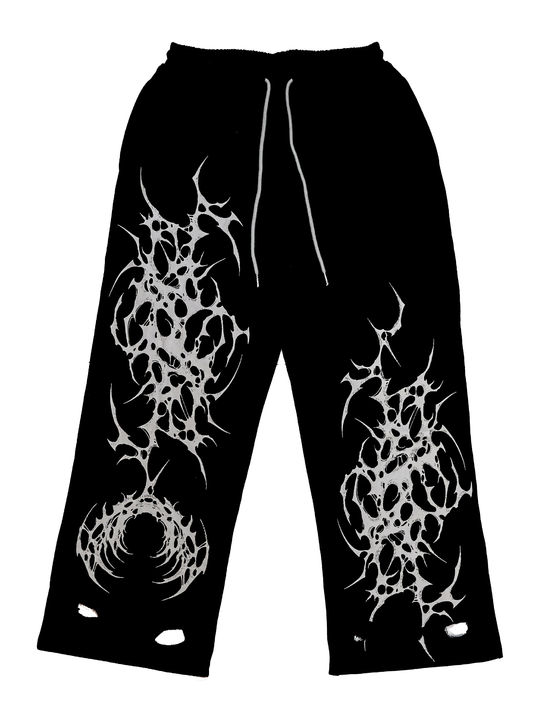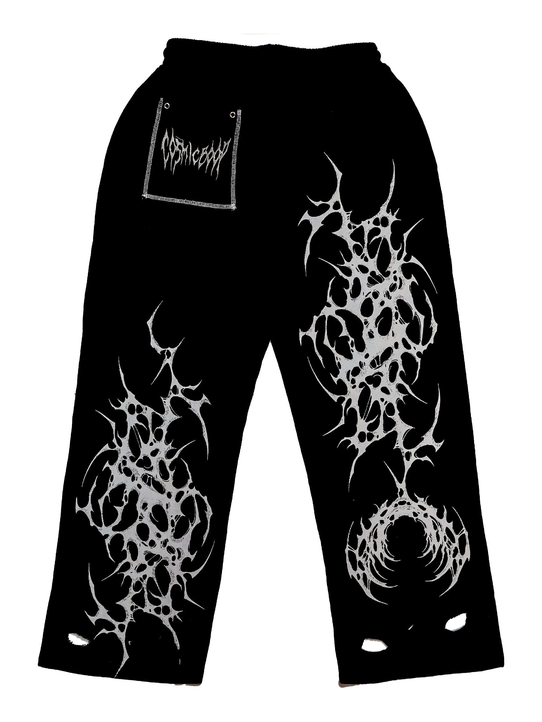 Screen printed design on an oversized, washed joggers. Features print designs on both legs and a contrast back pocket with embroidery. Comes with an elasticated waist with a grey draw string and two pockets. Trouser legs are straight cut with distressing on the hem.