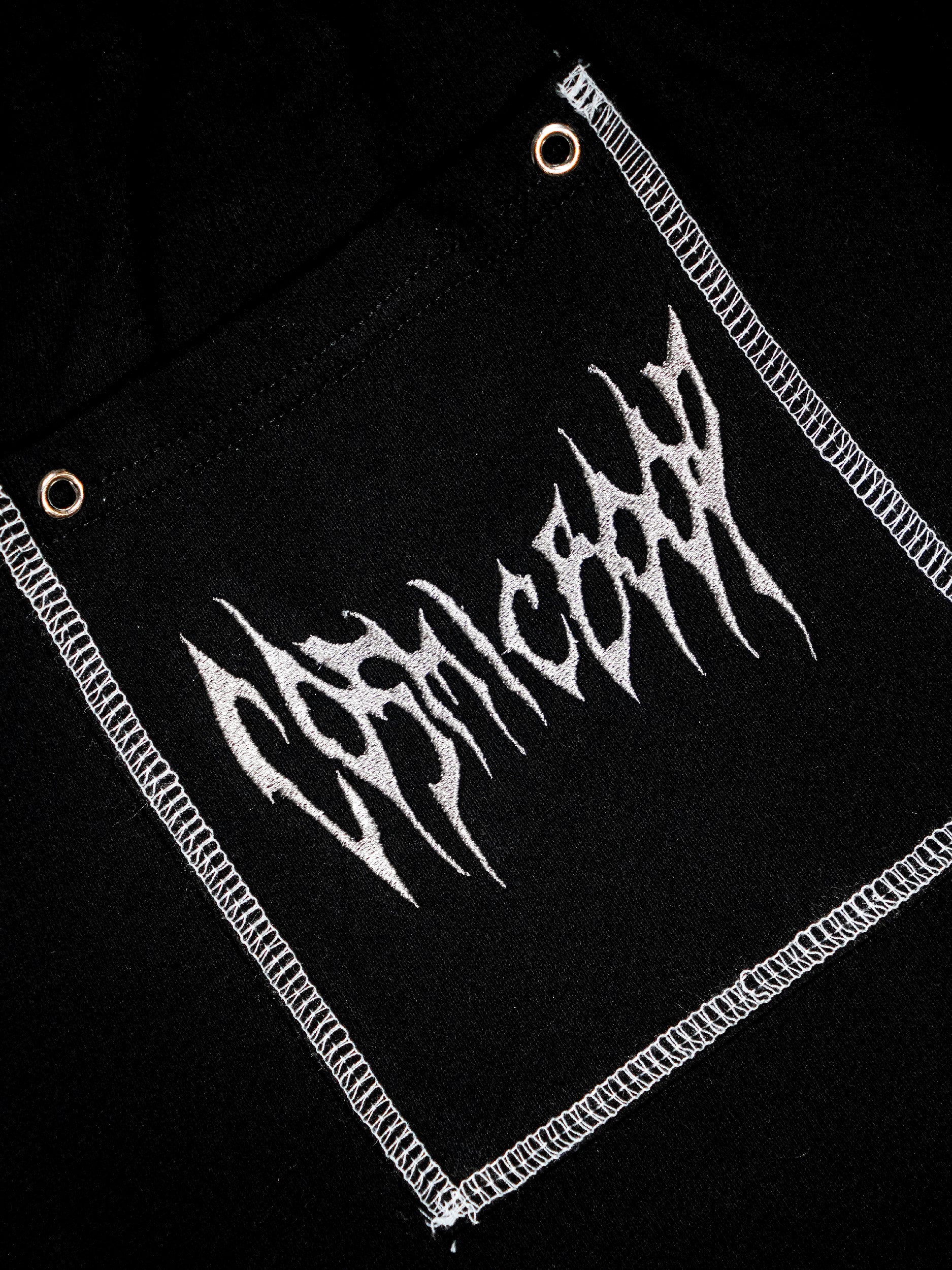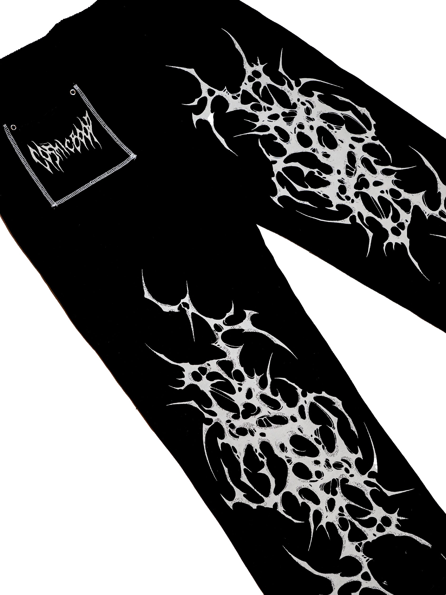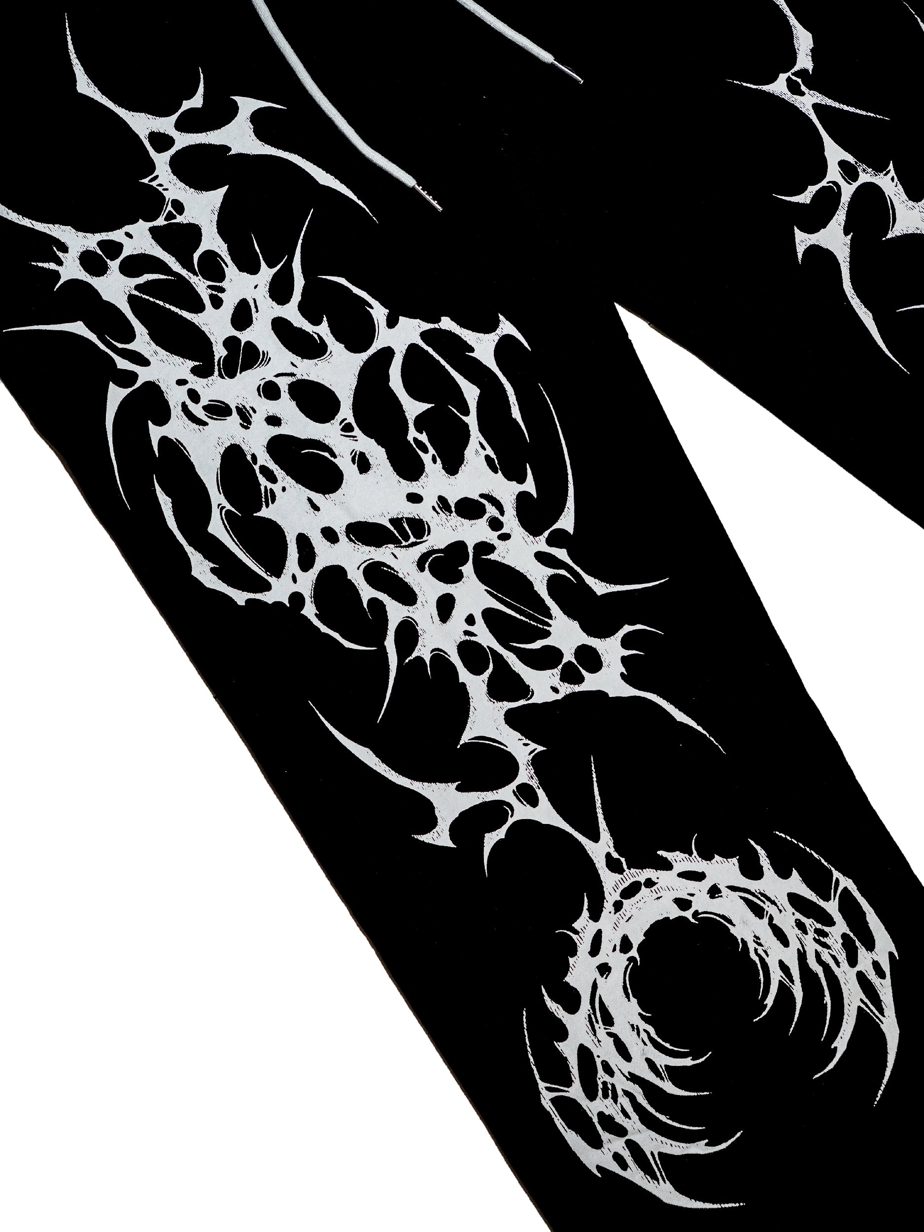 Screen printed design on an oversized, washed joggers. Features print designs on both legs and a contrast back pocket with embroidery. Comes with an elasticated waist with a grey draw string and two pockets. Trouser legs are straight cut with distressing on the hem.